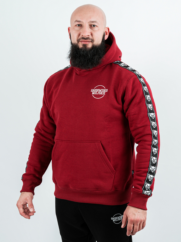 On the front of the hoodie, there is a printed logo of Środowisko Miejskie, created using silkscreen printing, ensuring long-lasting durability and vivid colors. Additionally, the sleeves are adorned with a black and white branded lampas, a distinctive feature of our brand. This unique detail adds a dynamic, sporty vibe to the hoodie while maintaining its minimalist style.