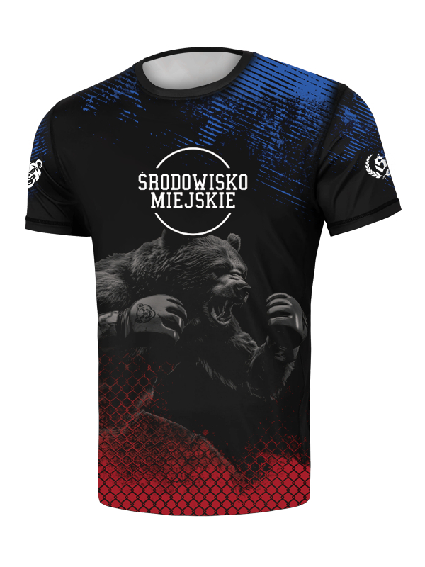 The front chest features a sublimation print of the Środowisko Miejskie logo alongside a dynamic graphic of a fighting grizzly bear—symbolizing strength and determination. The back showcases a large grizzly holding its guard, accompanied by our brand name for reinforced identity and athletic flair. Contrasting blue and red texture panels along the sides and around the collar add an energetic accent and highlight the shirt’s dynamic style.