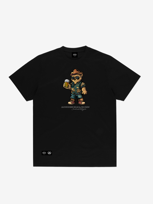 The "Alcotourist Bear" shirt comes in black, making it versatile and easy to pair with other wardrobe elements. On the front of the t-shirt, there is a print made using screen printing that depicts our bear dressed in a holiday outfit. The bear wears a colorful shirt, a hat, and sunglasses, holding a beer in its hand, adding a touch of fun and positive energy. This playful motif perfectly fits the summer vibe, making the t-shirt an ideal choice for vacation trips, gatherings with friends, or relaxing on the beach.