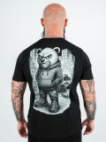 The front center chest features a small “Środowisko Miejskie” logo above a fierce bear face in screen print. A distressed finish adds an industrial edge. The back showcases a large monochrome graphic: an anthropomorphic bear in a hoodie standing amidst urban ruins—behind him lie a wrecked police car and empty high-rises. The grayscale print’s detailed shadows and textures create a dramatic atmosphere, while the “Bear Citizen” text at the bottom reinforces the sense of urban belonging.