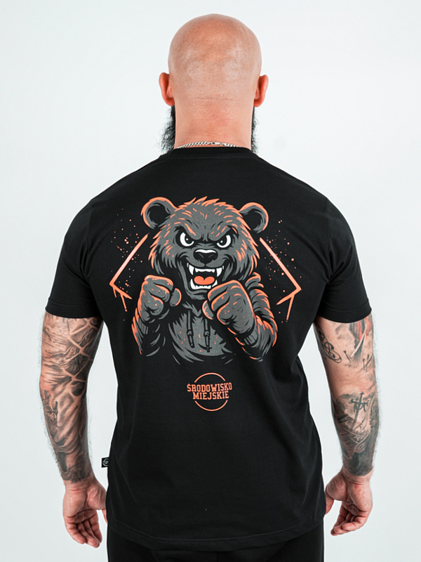On the front center chest, a stylized “ŚM Sport” logo in bright orange evokes graffiti and skate culture. The back features a striking illustration of a bear in a fighting stance with clenched fists and an intense gaze, framed by an orange geometric outline. All artwork is screen-printed for lasting color depth and durability.
