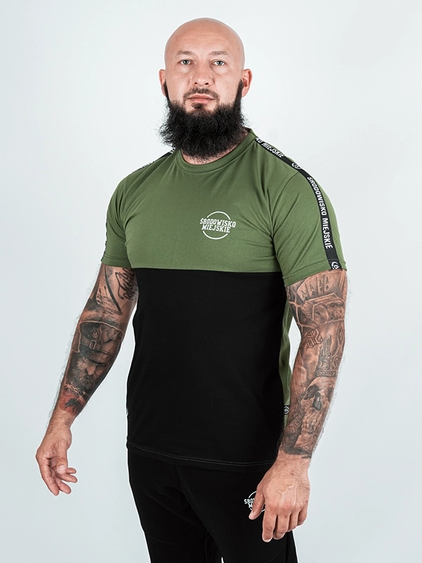 The front chest displays a discrete white screen-printed “Środowisko Miejskie” logo on the left side, accentuating brand affiliation without overpowering the design. The upper half of the tee is a vibrant olive that transitions sharply to deep black on the lower half, creating a visually slimming effect. Each sleeve is adorned with a textured tape featuring the brand’s signature black-and-white stripes, giving the tee authentic sport-inspired flair reminiscent of classic track apparel.