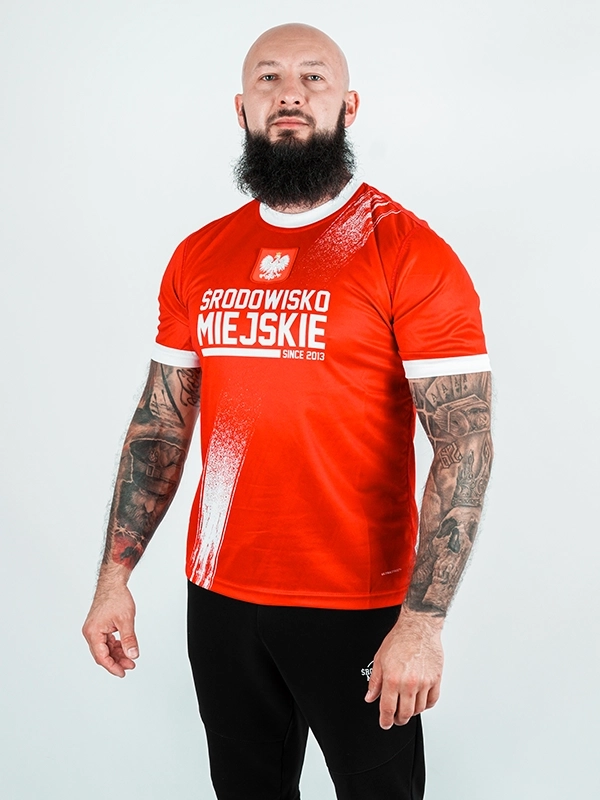 The "Polska - Essential" t-shirt was designed for those who appreciate subtle yet bold patriotic accents in their outfits. Made in a vibrant red color, the t-shirt features a jacquard patch of the Polish emblem on the chest. This symbol of national pride adds character and originality to the piece. Just below the patch, you'll find the "Środowisko Miejskie" logo, printed using sublimation for durability and fade resistance.