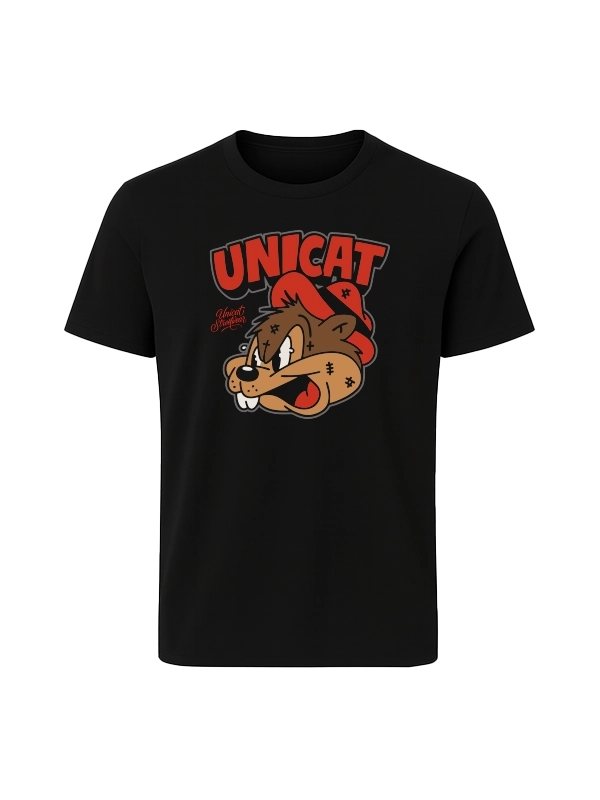 The Unicat Squirrel T-shirt perfectly embodies the essence of streetwear fashion. The front features a bold, eye-catching print of an aggressive cartoon-style squirrel wearing a cap, with the iconic Unicat logo displayed above. The dynamic red and brown tones make this tee stand out, while the plain black back balances the strong design on the front.
