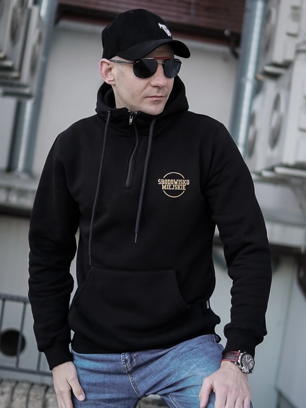 Bluza Classic występuje w ponadczasowym, głębokim czarnym kolorze, który pozwala dopasować ją idealnie do każdej stylizacji — sportowej, miejskiej, a nawet casualowej. Na lewej piersi znajduje się precyzyjny nadruk z logotypem Środowisko Miejskie, natomiast tył bluzy zdobi duże, wyraziste logo naszej marki w złotym kolorze, które mocno podkreśla tożsamość i charakter ubrania. Nadruk wykonany został trwałą metodą sitodruku, zapewniającą odporność na pękanie, ścieranie oraz działanie codziennych warunków.