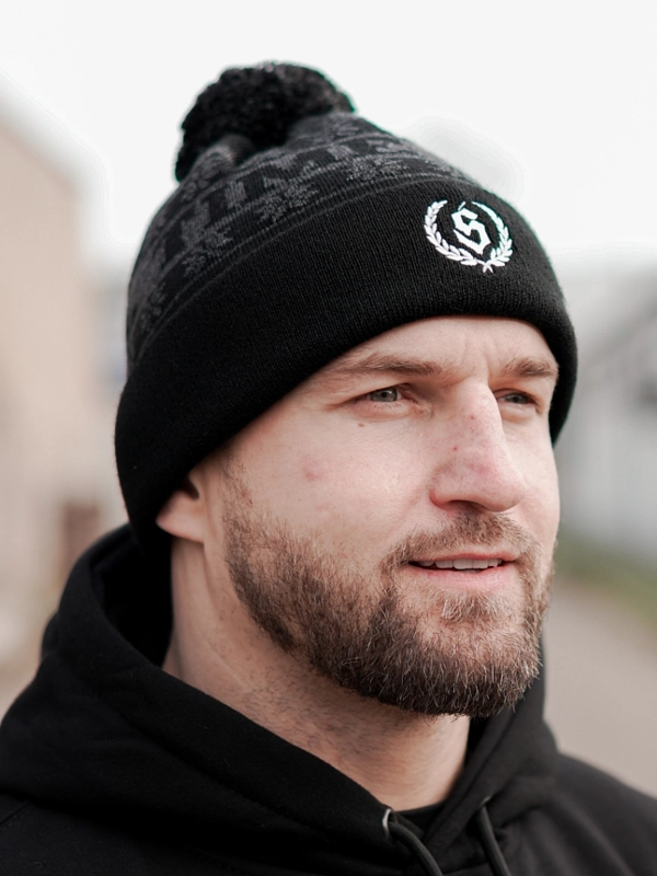 Czapka utrzymana jest w klasycznym, czarnym kolorze z szarymi wstawkami, które tworzą unikatowy wzór inspirowany zimowym klimatem. Całość dopełnia puszysty, miękki pompon, dzięki któremu model wyróżnia się w każdej stylizacji. Charakterystyczne elementy graficzne – niedźwiedzie, śnieżynki oraz motywy drzew – nadają czapce wyrazistości, a jednocześnie zachowują stonowany, elegancki wygląd.