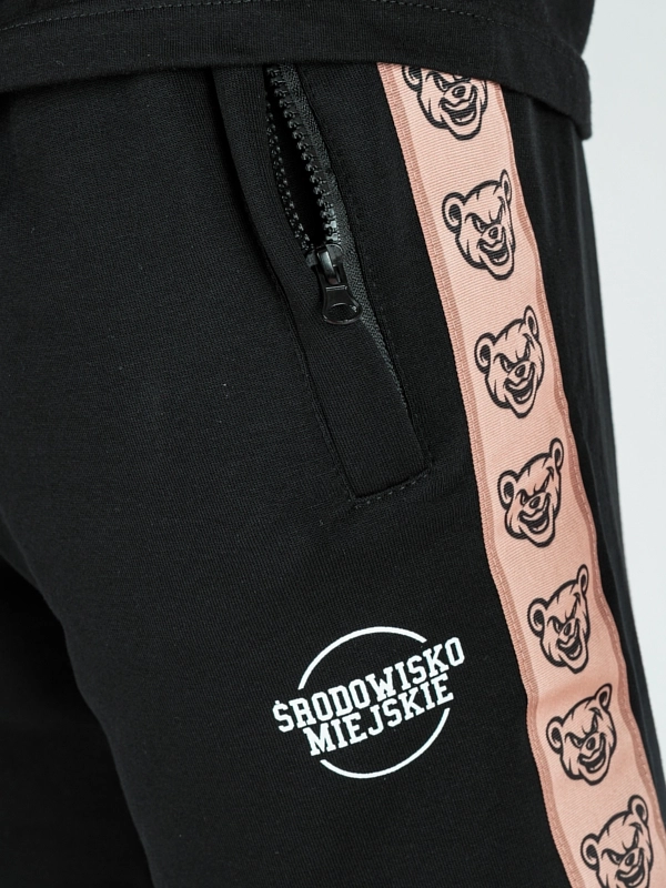 Na lewej nogawce, przy górnym szwie, znajduje się sitodrukowe logo Środowisko Miejskie – precyzyjne, odporne na blaknięcie i zachowujące intensywność czerni nawet po wielu praniach. Boczne szwy nogawek ozdobione są wąskimi, beżowymi lampasami wykonanymi z wytrzymałej taśmy. Lampasy nawiązują do klasycznych, sportowych modeli, a ich neutralny odcień beżu doskonale kontrastuje z czarnym tłem, dodając spodenkom unikalnego stylu.