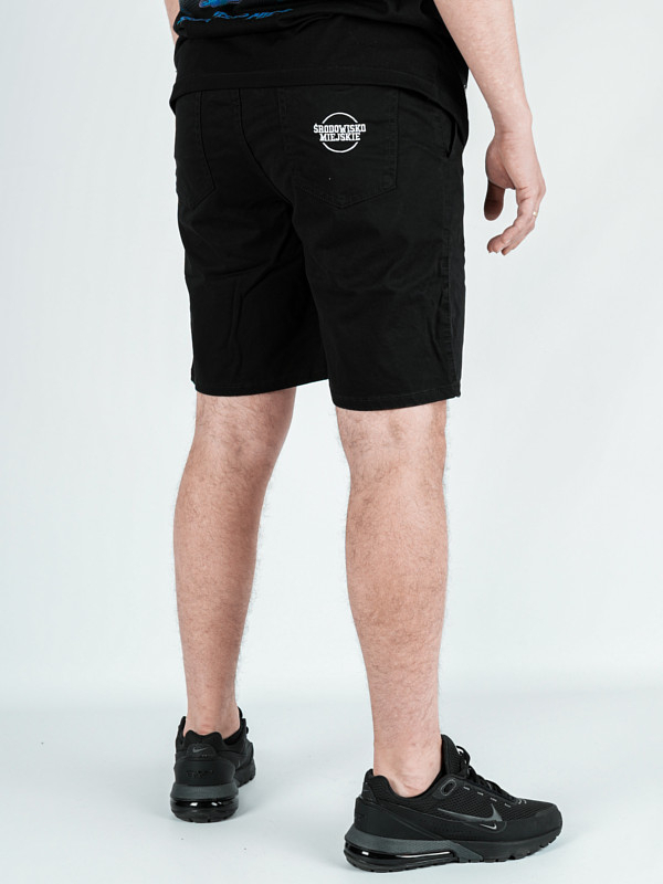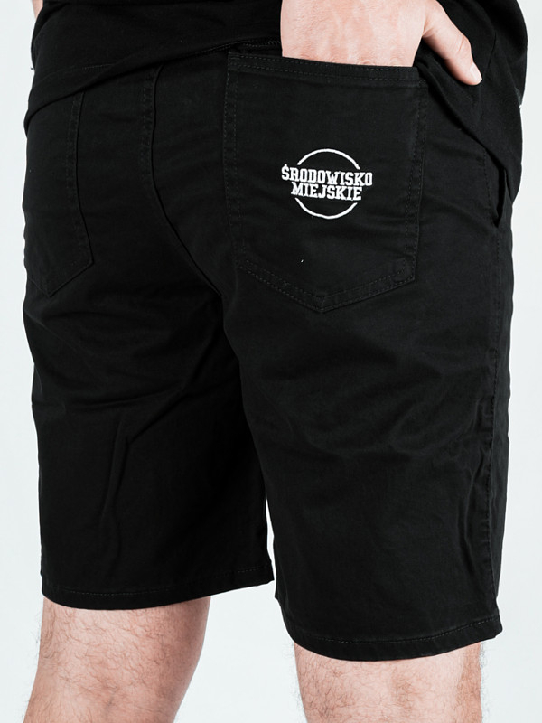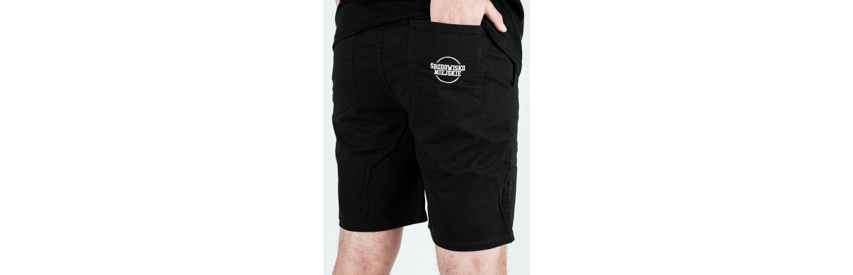Na prawej tylnej kieszeni znajduje się wyhaftowane białe logo Środowisko Miejskie. Ten subtelny, ale stylowy detal dodaje spodenkom elegancji i podkreśla ich unikalny charakter, jednocześnie wyrażając przynależność do miejskiego stylu życia.