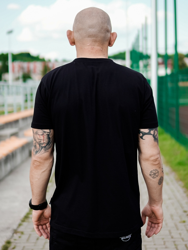 Koszulka Duo wyróżnia się klasycznym czarnym kolorem, który stanowi podstawowy element garderoby każdego miłośnika mody. Na przodzie, w centralnej części, znajduje się efektowny nadruk wykonany metodą sitodruku, który przedstawia połączone dwa dobrze znane loga – „Klasyk” oraz „Laur”. Te symbole, znane i cenione w świecie mody ulicznej, doskonale oddają ducha marki. Nadruk umieszczony jest na tle limonkowo-szarego kwadratu, co nadaje całości nowoczesny i dynamiczny wygląd, jednocześnie podkreślając oryginalność i charakter koszulki.