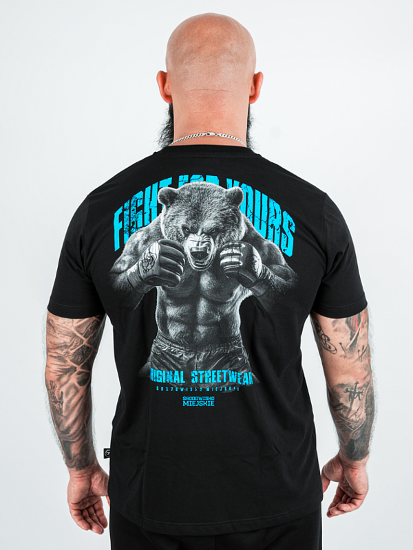Na przodzie, centralnie umieszczono distressed napis „Środowisko Miejskie” w energetycznym odcieniu niebieskiego, z subtelnym logo marki poniżej. Typografia z efektem postarzenia nadaje koszulce industrialnego charakteru. Tył zdobi imponująca grafika potężnego grizzly w bojowej pozie, z pięściami przy barkach, co symbolizuje siłę i determinację. Nad ilustracją widnieje dynamiczny napis „Fight Hours”, zaś poniżej motyw „Original Streetwear” wraz z małym logotypem ŚM.