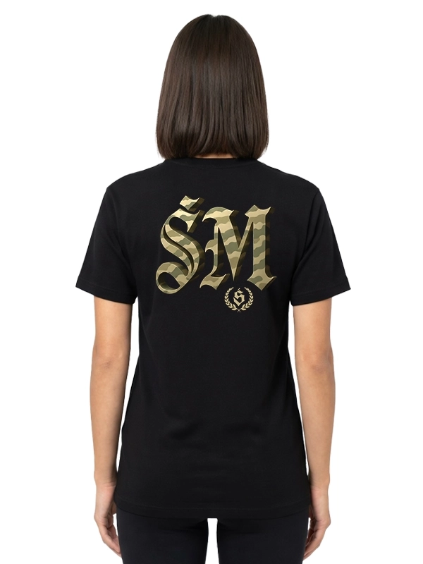 Tył koszulki rozwija historię. Duże, wyraźne inicjały „ŚM” w stylistyce moro budują silną tożsamość marki. Poniżej znajduje się subtelny wieniec laurowy – symbol zwycięstwa i konsekwencji. Całość tworzy balans między siłą a kontrolą. To nie chaos – to świadomy przekaz.