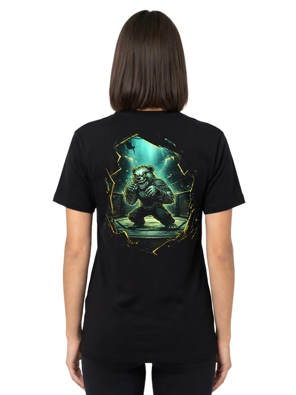 Tył koszulki to pełna eksplozja przekazu. Duża, dynamiczna grafika przedstawia niedźwiedzia w stylu zombie, gotowego do walki. Scena osadzona w klimacie walki i napięcia, z pękającą przestrzenią wokół, buduje efekt wejścia w inny stan – tryb działania bez ograniczeń. To obraz siły, która nie zna zmęczenia.