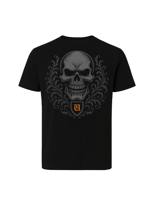 Koszulka Skull to propozycja dla osób, które chcą wyróżniać się na ulicy i podkreślać swój indywidualny charakter. Na przodzie koszulki znajduje się subtelne logo marki Unicat w formie tarczy z literą U w klimacie oldschool, natomiast tył zdobi imponujący nadruk przedstawiający realistyczną czaszkę otoczoną ornamentalnym wzorem. Projekt utrzymany w ciemnej kolorystyce symbolizuje siłę, niezależność i nieustępliwość.