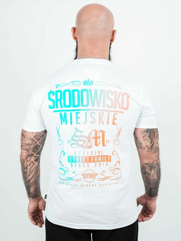 Koszulka Theme 2.0 w kolorze białym z nadrukiem w gradientach niebieskiego i pomarańczowego to wyjątkowy element garderoby, który przyciąga wzrok i wpisuje się w najnowsze trendy streetwearowe. W Środowisku Miejskim staramy się łączyć komfort, jakość i oryginalny design, a ta koszulka doskonale to odzwierciedla. Jej unikalny styl sprawia, że jest idealnym wyborem zarówno na co dzień, jak i na wyjątkowe okazje.