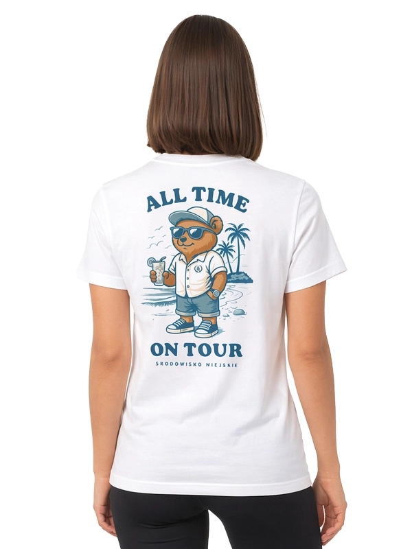Grafika z misiem–totemem marki, przedstawionym w wakacyjnym, swobodnym klimacie, buduje pozytywny, lekki przekaz. Hasło „All Time On Tour” podkreśla ideę ciągłego ruchu, ale rozumianego bardziej jako styl życia niż dosłowne przemieszczanie się. To koszulka dla tych, którzy żyją po swojemu, bez pośpiechu i bez narzuconych schematów.