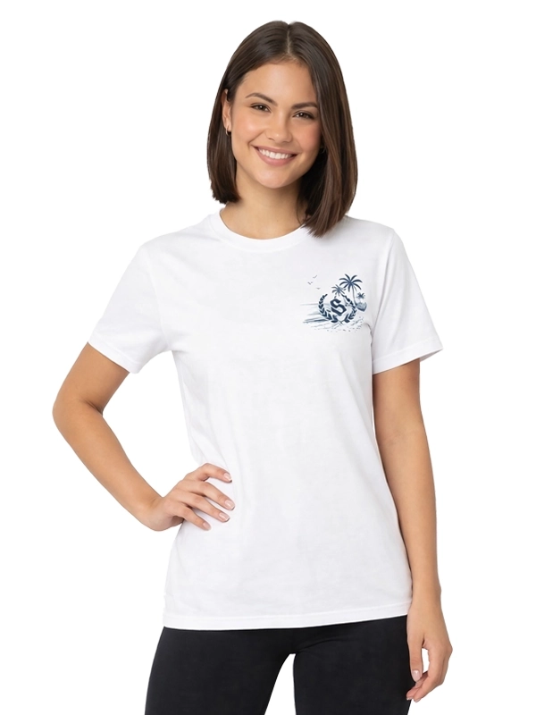 Projekt jest czytelny i wyrazisty, ale nadal spokojny. Minimalistyczny front z delikatnym akcentem marki równoważy dużą, ilustracyjną grafikę na plecach. Całość tworzy spójny, letni streetwear z charakterem.