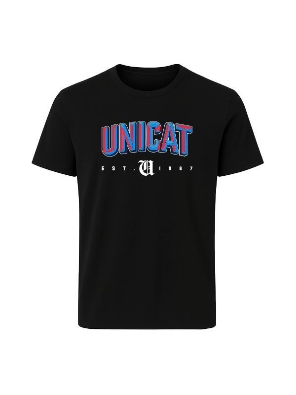 Na froncie koszulki znajduje się wyrazisty nadruk z napisem UNICAT w kolorach czerwieni i błękitu, podkreślający charakter marki oraz gotycka litera U z napisem „EST. 1987”, co nadaje całości ponadczasowego klimatu. Tył pozostaje jednolicie czarny – idealny wybór dla osób ceniących minimalistyczny styl.